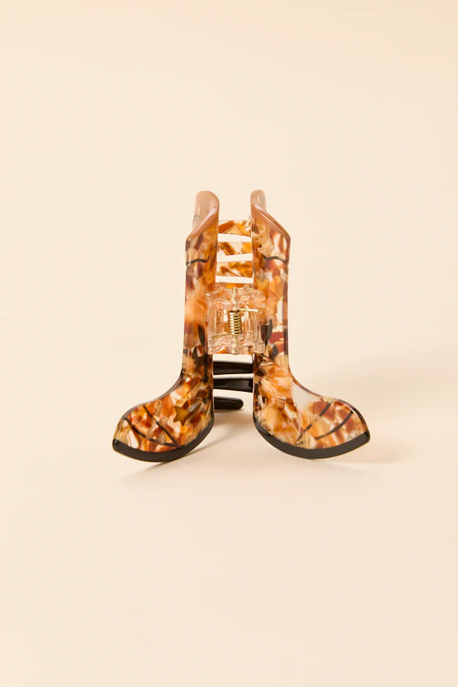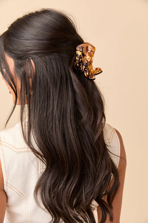 Kovboy çizmesi formunda tasarlanan bu eğlenceli saç klipsi, hem güçlü tutuşu hem de retro tarzıyla dikkat çekiyor. Yıldız detaylarıyla western ruhunu yansıtan toka, saçlarını acıtmadan kavrar ve gün boyu konfor sağlar.